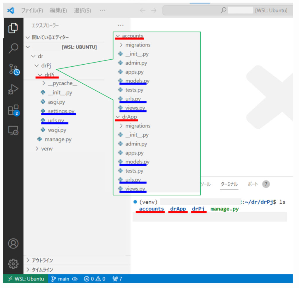 → 「drPj」フォルダと「manage.py」が存在していることを確認